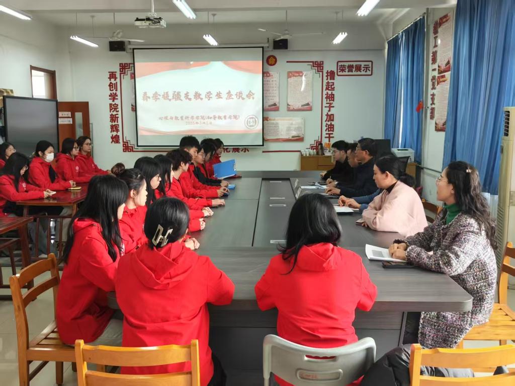 3月5日,冰球突破mg正规官网(初等教育学院)在教师教育楼二楼资料室召开2025年春季援疆支教学生座谈会,学院党政领导、辅导员、往届支教优秀学生代表、37名春季援疆支教学生参加会议。会议由学院党委副书记姜周主持。