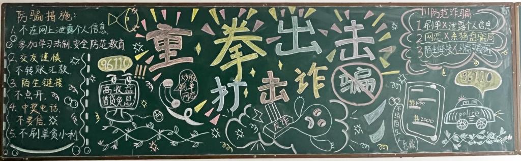 学院围绕“共筑安全防线 共享清朗空间”“防范电信网络诈骗”,组织 40 余个班级开展主题班会,学习《网络安全法》等法规与校园网络文明倡议书,结合学生涉诈案例剖析违规行为法律风险,提高了大学生防范网络诈骗的能力;同步开展“文明上网、你我同行”征文活动,引导学生结合自身经历与案例进行思考;此外,学院以黑板报打造“网络文明宣传角”,学生通过绘画、文字排版呈现网络文明知识,实现潜移默化教育。