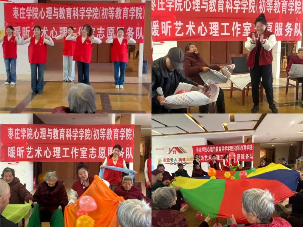 在枣庄市福兴养老院,暖昕艺术心理工作室志愿服务队开展了“乡村振兴·情暖夕阳”敬老慰问活动。活动以手语舞蹈和幸福拍手操开场,熟悉的旋律唤起了老人们的情感共鸣。随后,学院心理辅导站负责人带领老人们参与瑜伽球传递、情绪气球绘画、纱巾传球等活动,帮助老年人提升身体感知力,促进情感表达和人际交流,现场欢声笑语不断。志愿者们在活动中照护老人,细心搀扶、递水添衣,在互动中传递尊重、关爱与陪伴。