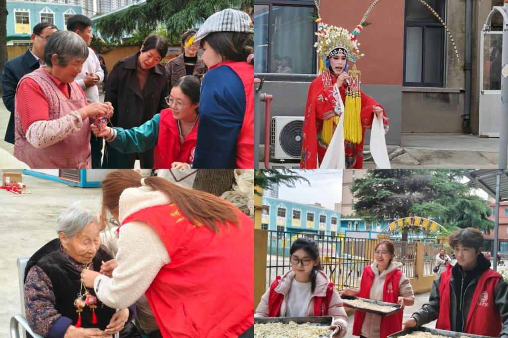 在前岭社区养老院,志愿者们提前到场完成布置,邀请老人们一起动手制作香囊,细致讲解、耐心陪伴。随后,师生为老人们带来的戏曲选段和踩高跷等文艺节目,老人们围坐观看、掌声不断,笑容洋溢。志愿者与老人们共同制作长寿面,分享热气腾腾的长寿面和菊花酒,寓意健康长寿、安康如意。